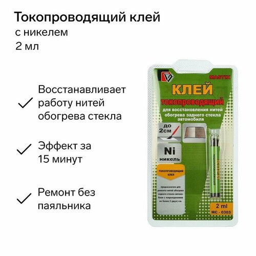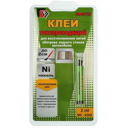 Токопроводящий клей на никелевой основе предназначен для ремонта нитей обогрева заднего стекла автомобиля с разрывами до 2 сантиметров. Инструкция по применениюТщательно взболтайте содержимое флакона. Отделите самоклеящуюся часть трафарета от подложки и разместите на стекле так, чтобы место разрыва было посередине прорези. С помощью кисти нанесите на стекло через трафарет слой клея сразу после перемешивания. Через минуту нанесите второй слой. Примерно через час, после высыхания клеевого шва, удалите трафарет. При температуре воздуха не ниже 20 °C восстановленная система обогрева будет готова к работе примерно через 2 часа. Одним тюбиком клея вы отремонтируете до 20 сантиметров повреждённых нитей.