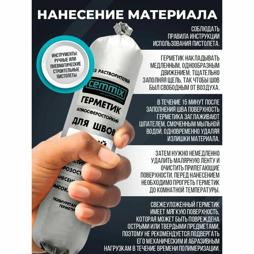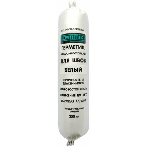 Клей-герметик для швов Cemmix представляет собой высокотехнологичное полиуретановое средство, с помощью которого можно тщательно загерметизировать швы. Подходит даже для тех поверхностей, которые подвергаются регулярному воздействию вибрации и влаги. Способствует надежному скреплению деталей, выполненных из таких материалов, как металл, кирпич, дерево, черепица и некоторые другие. Характеризуется прочностью и эластичностью, за счет чего состав хорошо заполняет швы разной глубины. Использовать клей-герметик вместе со специальным пистолетом.Особенности:объем составляет 350 мл;без растворителей;цвет — белый;возможно нанесение герметика даже при отрицательной температуре — до -15°C;температура эксплуатации составляет от -40°C до +90°C.отличается атмосферостойкостью, морозостойкостью и высокой адгезией;универсальность, за счет чего подходит как для внутреннего, так и для наружного применения;совместимость со всеми типами лакокрасочных поверхностей;после высыхания герметик можно подвергнуть окрашиванию;не вспенивается и не дает усадки;время высыхание составляет около 24 часов;Полезные рекомендациитщательно очистите поверхность от остатков прежнего герметика, частичек жира, пыли и прочих загрязнений;если поверхность сильно пористая и хрупкая, подвергается большим механическим нагрузкам и погружению в воду, то нужно воспользоваться грунтовкой для оснований из бетона;чтобы урегулировать глубину шва и предотвратить трехстороннюю адгезию в шов, предварительно нужно проложить эластичный шнур, выполненный из вспененного полиэтилена.Анти-плесень: ДаМарка: CEMMIXЦвет: БелыйОбъем (л): 0.35Минимальная температура применения (°C): -15Место использования: Внутренний / наружныйСтрана производства: РоссияНеобходим пистолет: ДаМатериал поверхности применения: БетонТип упаковки: ТубаМорозостойкость: ДаМаксимальная температура применения (°C): 35Срок годности (в месяцах): 12Назначение: УниверсальныйСостав: ПолиуретанВозможность окрашивания: ДаТермостойкость: ДаВремя высыхания (ч): 24Водонепроницаемый: ДаСпособ очистки: Сухая ветошьВес, кг: 0.594