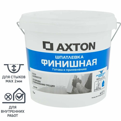 Шпатлевка Axton - белый пастообразный материал для финишного выравнивания поверхностей из ГВЛ, ГКЛ, цементной и гипсовой штукатурки, в сухих помещениях перед покраской, поклейкой обоев и нанесением декоративных покрытий. Преимущества Легкость шлифовки.Продукт полностью готов к применению.Для покрытия 1 м² потребуется около 2 кг смеси (при толщине слоя в 1 мм). Подготовка основания Поверхность основания должна быть сухой, очищенной от пыли, грязи и отслоений. Основание необходимо загрунтовать. Нанесение Перед использованием шпатлевку перемешать. Наносится и выравнивается широким шпателем слоями до 2 мм. Последующий слой наносится после высыхания предыдущего (спустя 6 часов). Время высыхания шпатлевки зависит от температуры и влажности воздуха. Наносить следует при температуре +10°С – +30°С и влажности воздуха 60-80%. После полного высыхания (24 часа) поверхность при необходимости отшлифовать и загрунтовать. Инструмент очищается водой. Состав акриловый сополимер, мрамор, вспомогательные добавки, загуститель, вода.Расход кг/м² при толщине слоя 1 мм ____________ 2Минимальная толщина слоя (мм) _________________ 0.15Максимальная толщина слоя (мм) ________________ 2Место использования ___________________________ ВнутреннийВес нетто (кг) ________________________________ 5Цвет __________________________________________ БелыйВремя высыхания между 2 слоями (ч) ____________ 24Минимальная температура применения (°C) _______ 5Максимальная температура применения (°C) ______ 30Страна производства ___________________________ РоссияМарка _________________________________________ AXTON