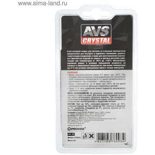 Клей AVK-107 — холодная сварка для металла со стальным наполнителем. Используется при ремонте, герметизации соединений, склеивании, восстановлении утерянных и повреждённых фрагментов изделий из чёрных и цветных металлов, работающих при температуре от ‒60 до +150 °C. ХарактеритикиВремя схватывания: 15 минут при температуре 20°С. На этот промежуток времени необходима взаимная фиксация деталей. Диапазон температур: от -60°С до +150°С. Масса: 55 г.