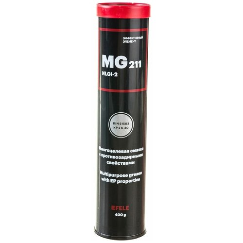 Литиевая смазка EFELE MG-211 - многоцелевая литиевая пластичная смазка (тип EP 2) с противозадирными присадками, предназначенная для работы при повышенных нагрузках в широком диапазоне температур (-30 °C.+120 °C). Применяется в узлах трения: подшипники качения, подшипники скольжения, направляющие скольжения, направляющие качения, зубчатые передачи, гибкие валы в оболочках, шлицевые / шпоночные соединения.