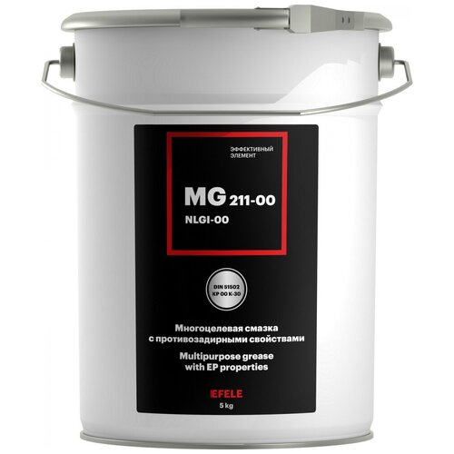 Литиевая смазка EFELE MG-211-00 - многоцелевая литиевая пластичная смазка (NLGI 00) с противозадирными присадками, предназначенная для работы при повышенных нагрузках в широком диапазоне температур. Применяется для узлов трения ходовой части автомобилей и подъемно-транспортных машин, подшипников шпинделей, подшипников электродвигателей и вентиляторов, подшипников механизмов общепромышленного оборудования, направляющих, шарико-винтовых передач металлообрабатывающих станков, узлов трения конвейерных систем, машин и установок в горнодобывающей, цементной и сталелитейной промышленности. Повышенная несущая способность (нагрузка сваривания 2400 Н)Обладает свойствами антиаварийной смазкиВысокая окислительная стабильностьУстойчивость к смыванию водойДлительный срок службыВысокие антикоррозионные свойстваХорошие противоизносные свойстваХорошая коллоидная стабильностьРаботает при температурах от -30 °C от +120 °C (кратковременно до +150 °С)