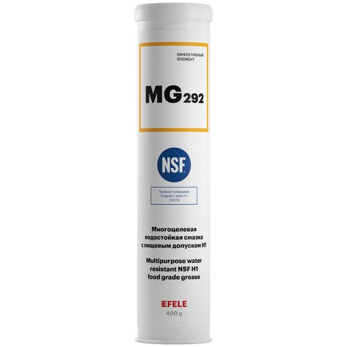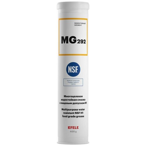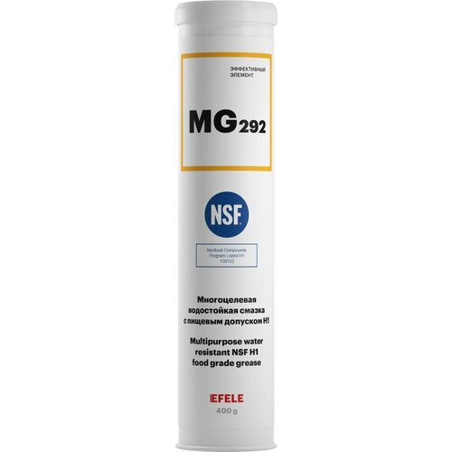 Многоцелевая водостойкая смазка с пищевым допуском EFELE MG-292 - пластичная водостойкая смазка с пищевым допуском H1 для узлов трения оборудования (в том числе пищевой и фармацевтической промышленности), работающего в тяжелых условиях эксплуатации при высоких нагрузках и/или в присутствии воды. Применяется для подшипников прессового оборудования, в т. ч. пресс-грануляторов (производство комбикорма), работающих на средних скоростях и подверженных высоким нагрузкам; высоконагруженных шарниров направляющих подвесных конвейеров и других узлов трения, работающих в условиях высоких нагрузок и контакта с водой. Диапазон рабочих температур: -25 °C.+150 °CНейтральный запахХорошая защита от коррозииХорошая устойчивость к воздействию горячей воды, пара и повышенных температурВысокая несущая способностьОтличные противоизносные и противозадирные свойстваНаличие пищевого допуска NSF H1