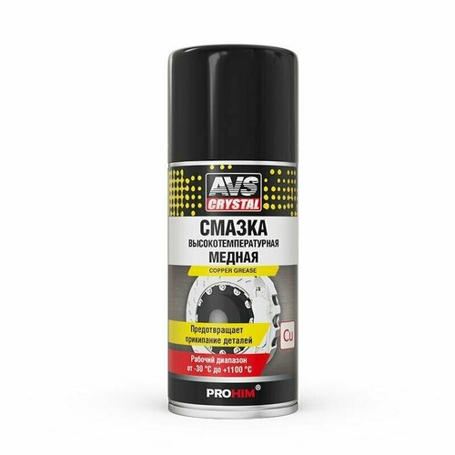 Смазка высокотемпературная медная 210 мл (аэрозоль) AVS AVK-342 Высокотемпературная полусинтетическая смазка с высоким содержанием мелкодисперсной меди и ингибиторов коррозии обеспечивает эффективную смазку болтов, шарниров, тормозных суппортов, ступиц колес, резьбовых соединений, клемм АКБ и т. п. Применяется для обработки нерабочих поверхностей тормозных колодок, соединительных деталей выхлопной системы, свечей зажигания, винтов, шарниров, фланцев полуосей с тормозами барабанного типа и т. д. Сохраняет долговременный смазочный эффект в температурном диапазоне от -30 до +1100°С.Способ применения: Использовать при температуре не ниже +10°С. Хорошо встряхнуть баллон. Нанести смазку тонким слоем на очищенные от рыхлой ржавчины и окалины обрабатываемые поверхности. Для труднодоступных мест использовать удлинительную трубочку.Внимание: избегать попадания на тормозные механизмы!Меры предосторожности: огнеопасно! Содержимое под давлением! Предохранять от воздействия прямых солнечных лучей, воздействия статического электричества и нагревания свыше +50°С. Не распылять вблизи открытого огня и раскаленных предметов! Использовать только на открытом воздухе или в хорошо вентилируемом помещении. Не курить во время пользования! Не разбирать и не давать детям! Не вдыхать испарения, избегать попадания внутрь, на открытые участки кожи и в глаза. При попадании на кожу или в глаза, обильно промыть чистой водой. При необходимости обратиться за медицинской помощью. Использовать только по назначению. Использованный баллон не сжигать, утилизировать как бытовой отход.Условия транспортировки и хранения: Рекомендуется хранить в хорошо проветриваемом сухом помещении на расстоянии не менее 1 м от нагревательных приборов, при температуре от +5 до +25°С. Не допускать сдавливания баллона, следить за сохранением целостности упаковки. Беречь от воздействия солнечных лучей и атмосферных осадков.Тип: аэрозольОбъем: 210 мл Смесь ароматических и алифатических углеводородов >30%, масло индустриальное <15%, литол <10%, ультрадисперсный медный порошок 5%, углеводородный пропеллент >15%.