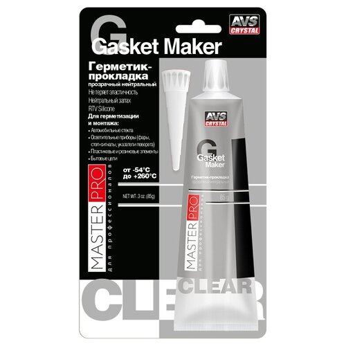 Герметик-прокладка нейтральный MasterPro "прозрачный" 85 гр. AVS AVK-347Предназначен для герметизации и монтажа:• Автомобильные стекла• Осветительные приборы (фары, стоп-сигналы, указатели поворота)• Пластиковые и резиновые элементы• Бытовые целиТемпературный диапазон: от -54°C до +260°CПредназначен для герметизации и монтажа:• Автомобильные стекла• Осветительные приборы (фары, стоп-сигналы, указатели поворота)• Пластиковые и резиновые элементы• Бытовые целиТемпературный диапазон: от -54°C до +260°CПрозрачный герметик-прокладка (нейтральный) предназначен для герметизации, ремонта и монтажа автомобильных стекол, фар, указателей поворота, стоп-сигналов, различных пластиковых и резиновых элементов. Для уплотнения войлочных, резиновых и пробковых прокладок. Безопасен для кислородных датчиков. Вулканизируется в состояние силиконового каучука при комнатной температуре. Остается прочным и эластичным во всем температурном диапазоне. Может применяться в быту.Не теряет эластичностьНейтральный запахRTV SiliconeИнструкция по применению:В качестве герметика-прокладки: Уберите старую прокладку и тщательно зачистите поверхность от старой прокладки, масла и грязи, обезжирьте поверхность. Обрежьте насадку по отметке, соответствующей требуемому диаметру шва, от 2 до 9 мм. Снимите защитный колпачок, проткните им мембрану и наденьте насадку. Нанесите непрерывный от 2 до 9 мм слой силикона на поверхность, окружив (закольцевав) все отверстия для болтов. Оставьте на 10-15 мин до подсыхания силикона. Начинайте сборку. Затягивайте до тех пор, пока силикон не начнет выдавливаться, но не перетягивайте. Учитывайте толщину необходимой прокладки. Излишки сразу же удалите ножом. Полное затвердевание через 24 часа. По истечению данного времени деталь можно вводить в эксплуатацию. Закройте тюбик колпачком после использования.В качестве уплотнителя вырубленных прокладок: Подготовьте поверхность и герметик, как было описано выше. Нанесите герметик тонким слоем на одну из поверхностей. Поместите новую прокладку на слой герметика. Нанесите тонкий слой герметика и на другую сторону новой прокладки. Оставьте на 10-15 мин до подсыхания силикона. Начинайте сборку. Затягивайте до тех пор, пока силикон не начнет выдавливаться. Излишки сразу же удалите ножом. Полное затвердевание через 24 часа. По истечению данного времени деталь можно вводить в эксплуатацию. Закройте тюбик колпачком после использования.Внимание! Вызывает раздражение кожи! Вызывает серьезные повреждения глаз! Пользоваться средствами защиты глаз и лица. При попадании на кожу: промыть большим количеством воды. При попадании в глаза: осторожно промыть глаза водой в течение нескольких минут. Использовать в хорошо вентилируемом помещении! Беречь от детей!Хранить при температуре от 0°С до +35°С. Не допускать замерзания.Нейтральный прозрачныйНейтральный запахТемпературный диапазон: от -54°C до +260°CТип: тубаВес: 85 гр. Поли(диметилсилоксан) гидроксильный, диметил силиконовое масло, карбонат кальция, модифицированный диоксид кремния, трис (2-метоксиэтокси) винилсилан, триэтокси (метил) силан.