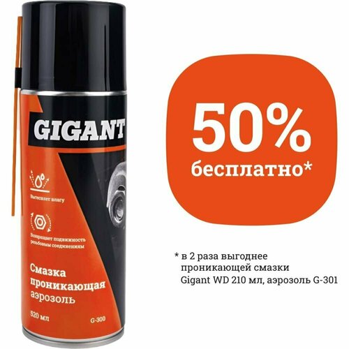 Проникающая смазка Gigant WD 520 мл, аэрозоль G-300 используется для упрощения отвинчивания заржавевших резьбовых соединений, смазывания трущихся поверхностей, удаления скрипов и заедания деталей. Отлично подходит для вытеснения влаги с различных деталей двигателя автомобиля. Состав смазки: органические растворители >35%, индустриальное масло >30%, смесь моющих, антикоррозийных, диспергирующих добавок <10%, озонобезопасный углеводородный пропеллент >20%.