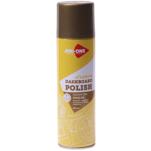 ОписаниеDashboard polish Lemon mdash; качественная полироль для панели приборов, пластиковых и виниловых деталей салона. Средство имеет аромат лимона, отлично полирует поверхности и придает им блеск, защищает от солнца, воды, устраняет электризацию. Препарат реализуется в компактном баллоне емкостью 220 мл.преимущества полироли AIM-ONE DASHBOARD POLISH:отлично полирует, придает блеск;защищает материалы от солнца;отталкивает воду, нейтрализует статический заряд;компактный баллон удобен в хранении.подходит для машины И домаDashboard polish может использоваться в салоне автомобиля или в быту, он подходит для полировки пластмассовых и других искусственных материалов. Использовать средство очень просто: достаточно распылить аэрозоль по поверхности и через минуту протереть тряпкой. На пластике образуется гладкий блестящий слой, придающий материалу привлекательный вид.Продукт эффективно противостоит вредному воздействию солнечных лучей: пленка не пропускает ультрафиолет, защищает поверхность от растрескивания и преждевременного старения. Кроме того, полироль отталкивает влагу и устраняет электризацию.Способ примененияУдалить пыль с поверхности;Встряхнуть баллон перед использованием;Нанести на расстоянии 15-20 см;Подождать одну минуту, дав составу впитаться;Отполировать поверхность до появления блеска чистой, мягкой и сухой тканью.