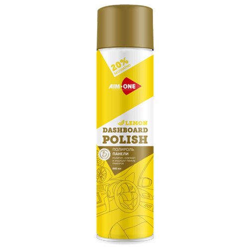 Dashboard Polish Lemon — полироль для панели приборов с ароматом лимона. Средство легко наносится, придает пластиковым и виниловым поверхностям блестящий вид, защищает материалы от старения, обладает антистатическим эффектом и отталкивает воду. Продукт выпускается в удобном большом баллоне объемом 840 мл.преимущества полироли AIM-ONE DASHBOARD POLISH:придает блестящий вид;эффективно защищает материалы;противостоит электризации и влаге;большой баллон, экономичный расход. для автомобиля И домаПолироль Aim-One легко наносится простым распылением, быстро впитывается (всего за 1 минуту). После растирания обработанная поверхность становится гладкой и блестящей. При этом, на ней образуется стойкая защитная пленка, предохраняющая пластик и винил от негативного влияния солнечных лучей (пересыхания и растрескивания). Пленка также имеет антистатические и водоотталкивающие свойства.Препарат Dashboard Polish используется для ухода за панелью приборов и элементами отделки салона. Кроме того, средство применимо в быту - для полировки пластиковых и ряда других искусственных поверхностей. Продукт поставляется в качественном баллоне, экономно расходуется.