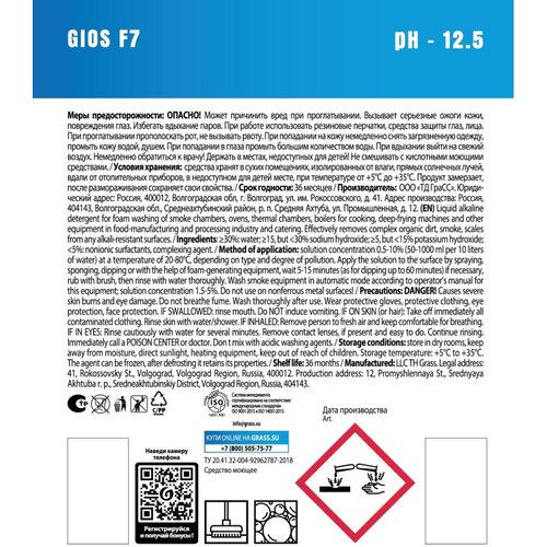 Моющее средство для тары и оборудования на пищевом производстве Gios Grass F7 18.5 (концентрат) Назначение: средство предназначено для пенной мойки коптильных камер, печей, термокамер, котлов для варки, фритюрниц и другого оборудования на предприятиях пищевой и перерабатывающей промышленностей, предприятиях общественного питания. Эффективно удаляет сложные органические загрязнения, копоть, нагары с любых щелочестойких поверхностей. Способ применения: средство используется в концентрации 0,5-10 % по объему (50-1000 мл на 10 литров воды), при температуре 20-80°С, в зависимости от типа и степени загрязнения. Рабочий раствор наносят на поверхность методом орошения, протирания, погружения или с помощью пеногенерирующего оборудования, выдерживают 5-15 мин (методом погружения до 60 мин) при необходимости растирают щетками, затем тщательно ополаскивают водой. Мойка коптильного оборудования в автоматическом режиме проводится в соответствии с инструкцией по эксплуатации на данное оборудование, концентрация рабочего раствора 1,5-5%. Состав: ?30% очищенная вода, ?15%, но <30% гидроксид натрия, ?5%, но <15% гидроксид калия, <5% неиогенные ПАВ, комплексообразователь. Условия хранения: хранить в сухом месте, изолированном от влаги, прямых солнечных лучей, вдали от отопительных приборов, в недоступном для детей месте. Продукт замерзает, после размораживания сохраняет свои свойства. Срок годности: 36 месяцев с даты изготовления.
