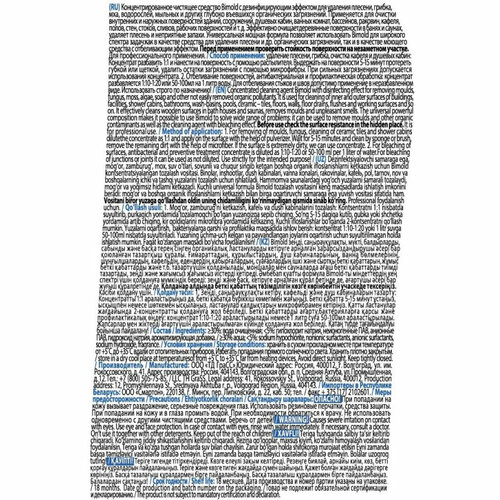Средство для удаления плесени Grass Bimold 1 л (концентрат). Назначение: концентрированное чистящее средство Bimold с дезинфицирующим эффектом для удаления плесени, грибка, мха, водорослей, мыльных и других глубоко въевшихся органических загрязнений. Применяется для очистки внутренних и наружных поверхностей зданий, сооружений, душевых кабин, ванных комнат, раковин, кафеля, полов, стен, стоков, сливов, рабочих поверхностей и т. д. Эффективно очищает деревянные поверхности в банях и саунах, удаляет плесень и неприятные запахи. Универсальная моющая формула позволяет использовать Bimold для широкого спектра задач: как в качестве средства для удаления плесени и др. органических загрязнений, так и в качестве моющего средства с отбеливающим эффектом. Перед применением проверить стойкость поверхности на незаметном участке. Способ применения: 1. Для удаления плесени, грибка, очистка кафеля и душевых кабин: Концентрат разбавить 1:1 и нанести на поверхность с помощью распылителя. Выдержать на поверхности 5-15 минут про