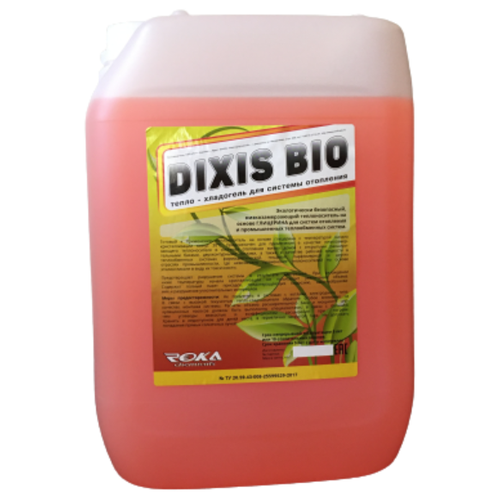 Экологичный антифриз на основе глицерина Dixis BIO готовый к использованию и и не требующий разведения водой безопасный теплоноситель. Безопасен так как используется без риска отравления парами или попадания в питьевую воду. Подобного вида антифризы рекомендуются в детских учреждениях. Сам по себе глицерин, который является основой данного антифриза является пищевой добавкой. Кроме этого он не горит, т.е пожаробезопасен. Теплоноситель имеет низкую температуру замерзания -30°С и высокий уровень теплоотдачи. Состав глицеринового антифриза рассчитан на работу с различными металлами и может прослужить до 8 лет.