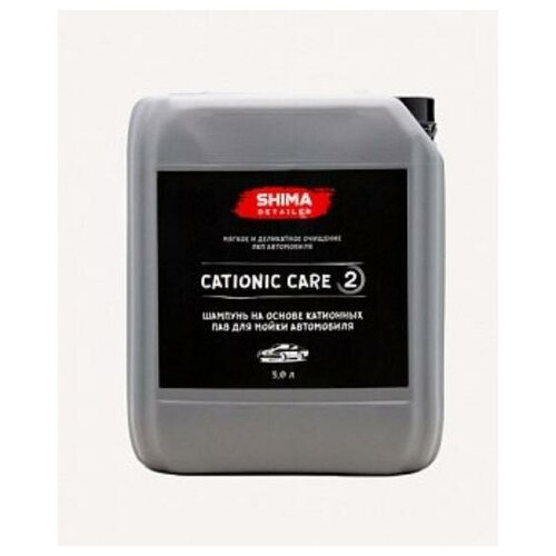 Шампунь на основе катионных ПАВ для мойки автомобиляШампунь на основе катионных ПАВ с положительно заряженными молекулами предназначен для мягкого и деликатного очищения ЛКП автомобиля. Является 2-м этапом 3-х фазной мойки. Ярко выраженный гидрофильный эффект способствует быстрому разрыву водяной пленки и её равномерному сходу, сокращая время на сушку автомобиля, тем самым подготавливая поверхность к 3-му этапу 3-х фазной мойки.Способ применения:1. Предварительно помыть автомобиль средством для мойки 1-й фазы SHIMA DETAILER «SOFT CARE».2. Нанести шампунь SHIMA DETAILER «CATIONIC CARE» на поверхность с помощью пенокомплекта 100 мл+900 мл воды или предварительно развести в ведре концентрат из расчета 50 мл на 10 л теплой воды. Нанести пену на кузов автомобиля (используя крупноячеистую губку с открытыми порами или варежку из шерсти мериноса) и затем подетально помыть (при этом для порогов и нижней части автомобиля желательно использовать другую губку).3. Смыть водой при помощи аппарата высокого давления.Состав:Вода очищенная >30%, композиция К-ПАВ >5%, комплексообразователи