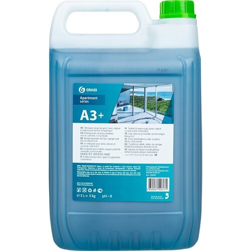 Моющее средство для стекол/зеркал и кафеля Grass Apartament series А3+ 5 л (концентрат). Назначение. Концентрированное моющее средство для стекол, зеркал, пластика и хрома, изделий их хрусталя, керамики и фарфора. Может применяться для чистки экранов и телевизоров, корпусной мебели и стеклянных витрин. Придает поверхности антистатические свойства. Не оставляет царапин, обеспечивает максимальную прозрачность без разводов и потеков. Экономично в применении. Способ применения. Применяется для ручной уборки. Используется в виде водного раствора в концентрации 1:10 (100 мл средства на 1 литр воды -10% раствор). Готовый раствор наносится на поверхность салфеткой или распылением. Протирается сухой бумажной салфеткой или тканью, не оставляющей волокон, до полного высыхания. Не требует смывания, не оставляет разводов. Состав: Очищенная вода, изопропонол, неиногенные ПАВ, ароматизирующий компонент, краситель Срок годности: 2 года с момента производства (при соблюдении условий хранения рекомендованных производителем).