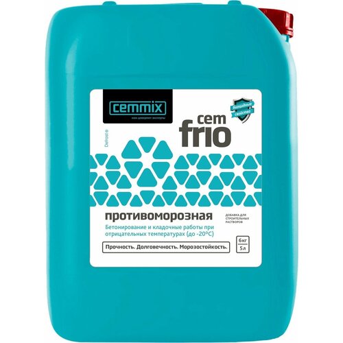 Комплексная противоморозная добавка для бетонных и растворных смесей. Обладает комбинированным противоморозным, ускоряющим, пластифицирующим действием. Добавка также ускоряет набор прочности, снижает количество химически несвязанной воды в бетоне и температуру замерзания жидкой фазы. Минимальный расход указан для температуры до -10°С включительно. Максимальный расход - для диапазона температур от -11°С до -20°С. Рекомендуется дозировать добавку с запасом в большую сторону, ориентируясь на примерные ночные температуры всего этапа набора прочности конструкции, так как ночная температура может быть значительно ниже дневной. Преимущества: - Позволяет проводить бетонные работы в условиях отрицательных температур от +10 до -20 °С; - Обеспечивает набор прочности бетона без применения дополнительной тепловой обработки; - Позволяет получить не менее 30% прочности бетона в возрасте 28 суток от марочной при расчетной температуре твердения не ниже минус (15±5)°С (в условиях неотапливаемого полигона при изготовлении монолитных и сборно-монолитных бетонных и железобетонных конструкций); - Снижает водопотребность бетонной/растворной смеси на 5 - 10%; - Увеличивает конечные прочностные характеристики бетона на 10% и более (в равнопластифицированных бетонных смесях, твердеющих в равных условиях); - Увеличивает сцепление бетона с закладной арматурой и металлоизделиями; - Позволяет получить бетон с повышенными показателями по водонепроницаемости, трещиностойкости, морозостойкости, долговечности. CemFrio может комбинироваться с другими материалами Cemmix. Для получения необходимых свойств бетонной смеси при использовании CemFrio с другими добавками необходимо провести лабораторные испытания для оптимизации состава бетонной смеси и проверки свойств бетона.
