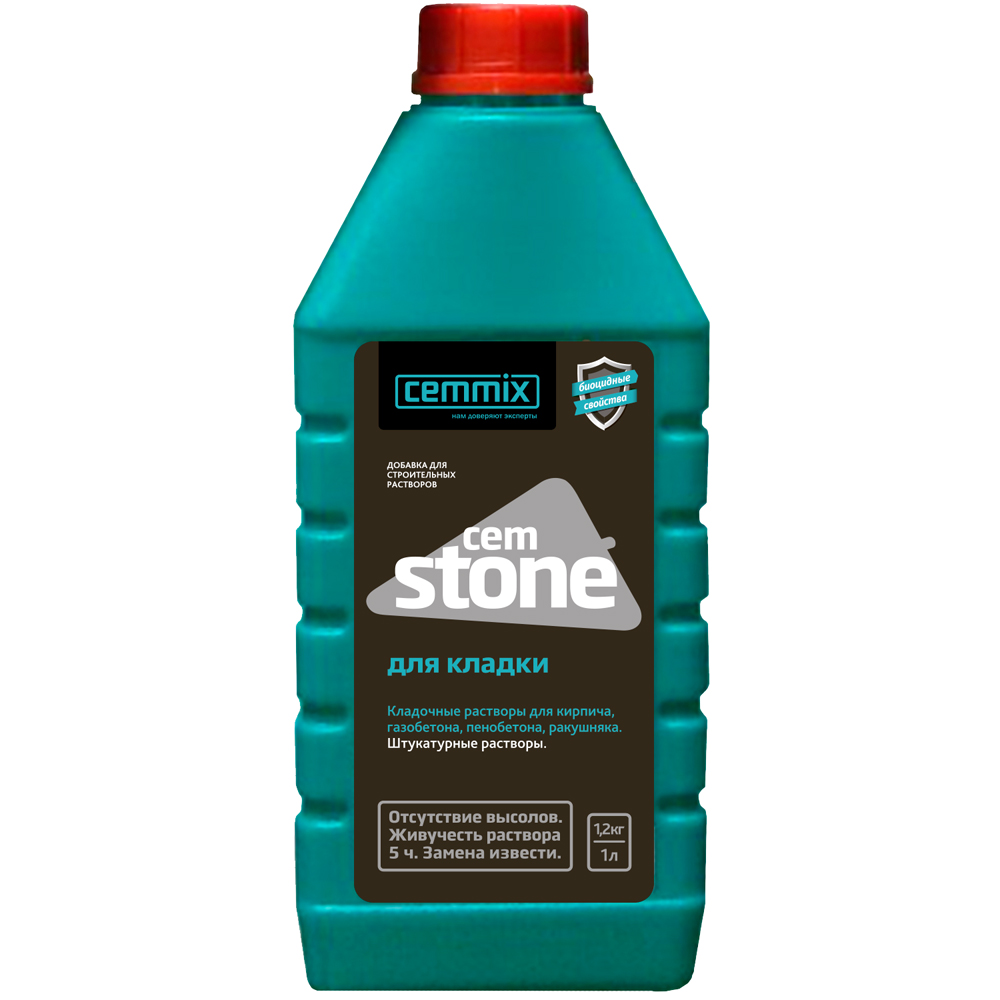 Придает смеси пластичность. Увеличивает живучесть раствора до 5 часов. Улучшает обрабатываемость, регулирует консистенцию. Расход зависит от требуемого уровня подвижности смеси, качества и чистоты используемых в замесе материалов. Для определения более точных результатов по расходу добавки необходимо проводить предварительный контрольный замес, исходя из текущих условий окружающей среды по влажности, содержания цемента в сухой смеси, качества и влажности песка и инертных заполнителей. Преимущества: - Повышает удобоукладываемость бетонных и растворных смесей с П1 до П4; - Препятствует образованию высолов на поверхности кирпича; - Снижает водопотребность бетонной/растворной смеси на 10 – 20 %; - Уменьшает усадочные деформации на 50%; - Обеспечивает до 5 часов сохранности раствора; - Увеличивает долговечность, морозостойкость и водонепроницаемость растворного шва; - Позволяет работать на всех видах песка; - Обеспечивает 100% прочности на 7 сутки; - Экономит цемент. CemStone может комбинироваться с другими материалами Cemmix. Для получения необходимых свойств бетонной смеси при использовании CemStone с другими добавками необходимо провести лабораторные испытания для оптимизации состава бетонной смеси и проверки свойств бетона. Комплексная добавка для кладочных и строительных растворов. Препятствует расслоению и водоотделению растворной смеси. Основа: водный раствор синтетических ПАВ; Внешний вид: непрозрачная жидкость светло-коричневого цвета; Плотность: 1,18 кг/дм³ (при 20 °C); Показатель pH: 9,5 - 11,0; Расход: 0,25 - 0,5 л на 100 кг цемента; Объём: 1 л.