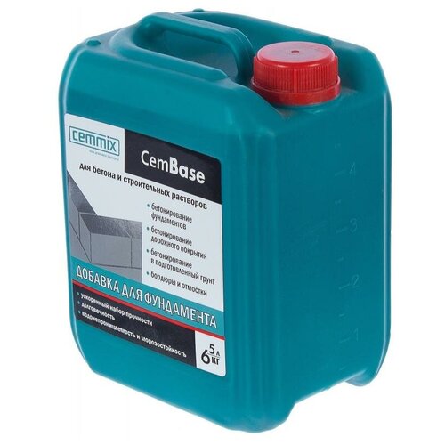Добавка для фундамента Cemmix CemBase (5 л) — многофункциональная жидкая добавка для строительных растворов. Используется при бетонировании фундаментов, монолитных стен, дорожного покрытия, при подготовке основы под фундамент, брусчатку.Преимущества добавки:- Увеличивает морозоустойчивость, водонепроницаемость, прочность и плотность.- Снижает водопотребность бетонной смеси, требуемое количество цемента.- Улучшает растекаемость и удобство укладки бетона, позволяет обойтись без вибратора.- Повышает однородность и улучшает перемешиваемость бетона, раствора.- Минимизирует усадку, предотвращает возникновение трещин.- Применима для использования во влажных условиях.Способ применения: необходимое по инструкции количество добавки растворяют в половине предназначенной для замеса воды, после чего производят замешивание бетона (раствора), добавляя в него по мере необходимости вторую половину воды.Расход: 1 л на 100 кг цемента.