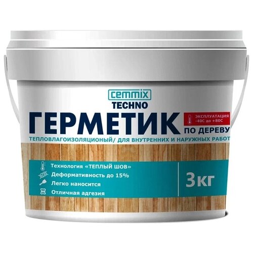 Герметик Cemmix «Тёплый шов» – это специальный герметик, который используется для утепления и заделки швов практически в любом месте деревянного или каркасного домостроения. Повышенные эластичные свойства позволяют выдерживать продольное и поперечное растяжение до 300%, что позволяет выдерживать перепады температур и влажности, исключая выпадение из швов. Специально разработанная композиция на основе акрила и сложных сополимеров, сочетает в себе качества герметика, теплоизоляции и гидроизоляции. Применение герметика по дереву «Тёплый шов» исключает появление сквозняков, устраняет «мостики холода», продувания и попадание влаги через наружные швы в помещения, при этом обработанные швы и примыкания остаются паропроницаемы. Преимущества: - Повышенная эластичность и упругость; - Низкая теплопроводность и паропроницаемость; - Широкий диапазон температуры эксплуатации; - Экологичность и долговечность; - После высыхания можно окрашивать. Применяется: - Для заполнение швов между бревнами, брусом и другими стыками; - Для установок дверных и оконных блоков; - Для герметизации элементов из пластмассы, металла, дерева - Для герметизация и заделка трещин шириной до 5 см; - Для использования в местах повышенной влажности; - Подходит для внутренних и наружных работ. Основа: акриловая; Внешний вид материала: паста; Плотность: 1,5 ± 0,05 кг/л; Скорость полимеризации (при +20 °С и 65% относительной влажности): 2 мм/сутки; Допустимая деформация: ±25 %; Относительное удлинение при разрыве: 300 %; Температура эксплуатации: от -40 до +60 °С; Температура нанесения: от +5 до +30 °С; Прогнозируемый срок службы: не менее 30 лет; Начальное время полимеризации: 75 мин; Цвет: белый; Объём: 3 кг.