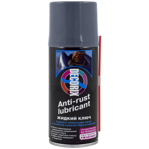 Жидкий ключ DECORIX облегчает демонтаж заржавевших резьбовых соединений, прикипевших болтов и гаек, защищает от коррозии и окисления, смазывает различные механизмы, дверные петли, вытесняет влагу с металлических поверхностей и поверхности проводов.Жидкий ключ DECORIX обладает повышенными антикоррозионными и смазочными свойствами, образуя стойкую к коррозии защитную плёнку. Идеально подходит для смазки и консервации различных частей и механизмов.Не агрессивен к лакокрасочным покрытиям, пластику, резине.