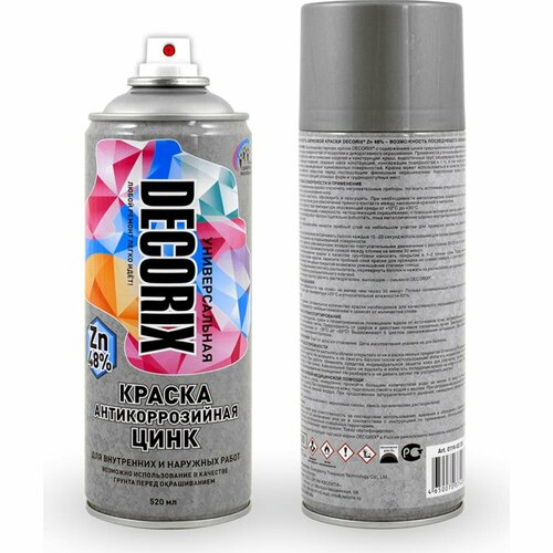 Особенность Цинковой краски DECORIX® Zn 48% – возможность последующего окрашивания.Высококачественная краска DECORIX® с содержанием цинка 48% предназначена для длительной защиты металлических поверхностей от коррозии и декоративного окрашивания. Применяется для окрашивания и антикоррозийной обработки металлических изделий и конструкций: крыш, водосточных труб, резервуаров, наружных отливов, оград, кованных изделий, сварных швов конструкций, консервации поверхностей и т. п., в том числе ремонтного окрашивания повреждённых оцинкованных поверхностей.Краска может использоваться в качестве грунтовочного антикоррозийного покрытия перед последующим финишным окрашиванием. Аэрозольная краска удобна для окрашивания конструкций сложных форм и труднодоступных мест.