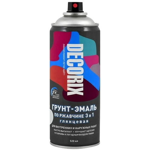 Высококачественная грунт-эмаль по ржавчине DECORIX предназначена для защитно-декоративного окрашивания заржавевших или подверженных коррозии поверхностей из сплавов чёрных металлов при бытовом применении, декоративно-оформительских работах, строительстве и ремонте.Предназначена для окрашивания: древесины, пластика, металла, бетона, кирпича, керамики, стекла, картона и минеральных поверхностей. Сочетает в себе свойства нейтрализатора коррозии, грунтовки и защитно-декоративной эмали («3 в 1»), что позволяет сократить время на подготовку поверхности перед окрашиванием. Применяется для ремонтного окрашивания металлических изделий, инструментов и других видов работ.Аэрозольная грунт-эмаль по ржавчине удобна для окрашивания не больших поверхностей и труднодоступных мест. Также подходит для поверхностей из древесины, бетона, камня, стекла, керамики и некоторых видов пластмасс. Грунт-эмаль образует гладкое глянцевое покрытие, устойчивое к выцветанию.