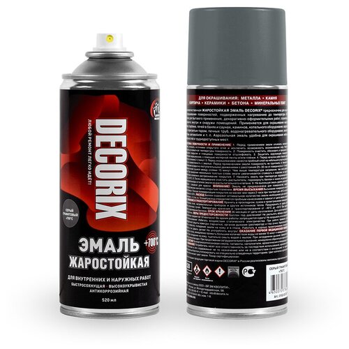 Высококачественная жаростойкая эмаль DECORIX® предназначена для защитного окрашивания поверхностей, подверженных нагреванию до температуры +700°С, а также для бытового применения, декоративно-оформительских работ, строительства и ремонта внутри и снаружи помещений. Применяется для окрашивания мангалов, грилей, барбекю, печей в банях и саунах, каминов, котельного оборудования, паропроводов с перегретым паром, печных труб, водонагревательного оборудования, выхлопной системы автомобиля и т. п. Аэрозольная эмаль удобна для окрашивания небольших поверхностей и труднодоступных мест.