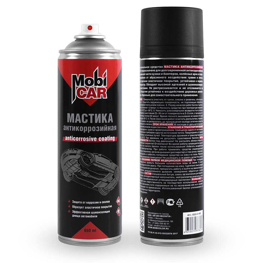 Профессиональное средство мастика антикоррозийная MobiCAR® предназначено для долговременной антикоррозийной защиты нижней части кузова и бамперов, колёсных арок и порогов автомобиля от абразивного воздействия гравия и песка.Образует прочное эластичное покрытие, устойчивое к перепадам температур.Обладает высокой адгезией и шумоизолирующими свойствами.Не растрескивается и не отслаивается на морозе.Покрытие устойчиво к воздействию дорожных реагентов и соли.Идеально для самостоятельного применения.применение1. Поверхность очистить от грязи, смазки и ржавчины, обезжирить и просушить.2. Защитить окружающие поверхности, не подлежащие обработке, с помощью малярной ленты и/или плёнки.3. Перед началом работ баллон тщательно взболтать, в течение 1–2 минут.4. Наносить средство при температуре окружающей среды от +10°С до +30°С.5. Наносить равномерными возвратно-поступательными движениями с расстояния 25–30 см от поверхности в 2–3 слоя, с промежуточной сушкой между слоями 60 минут.Время полного высыхания не менее 24 часов при температуре +20°С.6. После окончания работ очистить распылитель: перевернуть баллон и нажать на распылитель до прекращения выхода остатков средства из распылительного клапана.