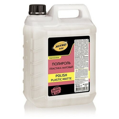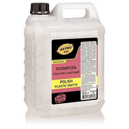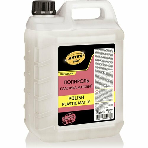 AC-23651 ASTROhim Полироль пластика матовый, Бабл гам 5 кг - Профессиональное средство для ухода за пластиковой, виниловой и резиновой отделкой автомобиля. Эффективно очищает и полирует поверхность. Обновляет цвет пластика, формируя на поверхности эффектное матовое покрытие и подчеркивая ее естественную структуру. Антистатические компоненты, содержащиеся в составе, предотвращают чрезмерное оседание пыли на поверхность. Не оставляет жирной и липкой пленки. Защищает от разрушительного воздействия солнечных лучей, предотвращая выгорание и растрескивание пластика. Наполняет салон приятным ароматом.