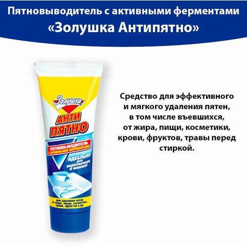 Мягкий пятновыводитель с желчным концентратом "Антипятно. Золушка".Средство эффективно удаляет перед стиркой пятна, в том числе и въевшиеся, от жира, пищи, косметики, крови, фруктов, травы.Идеально для воротничков и манжет.Способ применения: нанесите средство непосредственно на пятно или на загрязненное место (например, воротник рубашки) и оставьте на 5-10 минут. После этого постирайте изделие, как обычно