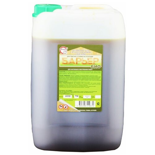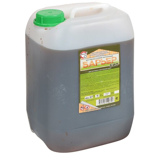Сертифицированное, высокоэффективное средство для комплексной биозащиты деревянных изделий и сооружений, подвергающихся тяжелым условиям эксплуатации. Состав не содержит лаковой основы, хорошо впитывается в поверхность древесины. Поверхности, обработанные составом «Барьер Био» приобретают тёмно-коричневый оттенок, напоминающий цвет мареного дуба.Такие сооружения и конструкции из дерева, как деревянные беседки, срубы, заборы и т. д после обработки пропиткой, благодаря наличию в ней водоотталкивающих, защитных и декоративных свойств, в дополнительной окраске лакокрасочными покрытиями не нуждаются. Обработка деревянных полов и других конструкций из дерева, продлевает срок их службы в несколько раз. Поверх пропитки может наноситься любое декоративное покрытие. Состав экологически чистый, пожаро- и взрывобезопасен.Расход: 0.3 л/м².Условия нанесения: Температура не ниже +5°С.Время высыхания 1 слоя: 20 минут.Время полного высыхания: 3-4 часа.Срок хранения: 12 месяцев.ПрименениеПоверхность древесины, подлежащая обработке, должна быть очищенной от старой краски, не иметь масляных и битумных пятен. Допускается нанесение на влажную поверхность. Состав наносят кистью, валиком или пластмассовым распылителем на не струганую древесину за два раза, а на струганую за три раза, с перерывом между нанесением в 20 минут.Не допускайте полного высыхания поверхности при нанесении промежуточных слоёв, т. к. последующие слои не будут впитываться.Меры предосторожностиПри проведении работ использовать резиновые перчатки и спецодежду.При попадании на кожу антисептик смыть тёплой водой с мылом.Не допускать контакта с пищевыми продуктами.После замораживания/размораживания свойств не теряет.