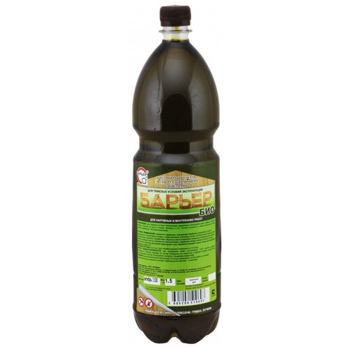 Сертифицированное, высокоэффективное средство для комплексной биозащиты деревянных изделий и сооружений, подвергающихся тяжелым условиям эксплуатации. Состав не содержит лаковой основы, хорошо впитывается в поверхность древесины. Поверхности, обработанные составом «Барьер Био» приобретают тёмно-коричневый оттенок, напоминающий цвет мареного дуба.Такие сооружения и конструкции из дерева, как деревянные беседки, срубы, заборы и т. д после обработки пропиткой, благодаря наличию в ней водоотталкивающих, защитных и декоративных свойств, в дополнительной окраске лакокрасочными покрытиями не нуждаются. Обработка деревянных полов и других конструкций из дерева, продлевает срок их службы в несколько раз. Поверх пропитки может наноситься любое декоративное покрытие. Состав экологически чистый, пожаро- и взрывобезопасен.Расход: 0.3 л/м².Условия нанесения: Температура не ниже +5°С.Время высыхания 1 слоя: 20 мин.Время полного высыхания: 3-4 часа.Срок хранения: 12 месяцев.ПрименениеПоверхность древесины, подлежащая обработке, должна быть очищенной от старой краски, не иметь масляных и битумных пятен. Допускается нанесение на влажную поверхность. Состав наносят кистью, валиком или пластмассовым распылителем на не струганую древесину за два раза, а на струганую за три раза, с перерывом между нанесением в 20 минут.Не допускайте полного высыхания поверхности при нанесении промежуточных слоёв, т. к. последующие слои не будут впитываться.Меры предосторожностиПри проведении работ использовать резиновые перчатки и спецодежду.При попадании на кожу антисептик смыть тёплой водой с мылом.Не допускать контакта с пищевыми продуктами.После замораживания/размораживания свойств не теряет.
