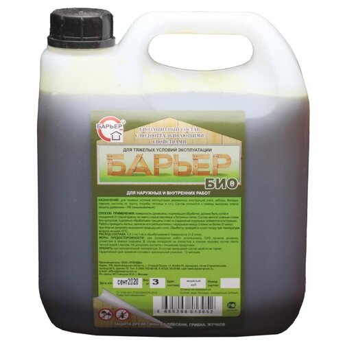 Невымываемый антисептик для дерева Барьер-Био (мореный дуб) предохраняет древесину от негативных атмосферных воздействий и биопоражений.Долговечный и эффективный состав проникает глубоко внутрь древесины, не смывается осадками, не разлагается под действием ультрафиолета. Обладает влагоотталкивающими свойствами. Окрашивает поверхность в глубокий зеленовато-коричневый оттенок.Обеспечивает самый высокий класс защиты НВ (невымываемый). Подходит для тяжелых условий эксплуатации деревянных конструкций: лаги, заборы, беседки, лавочки, настилы по грунту, погреба, теплицы.