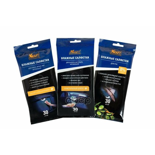 Влажные Салфетки 90 Шт (3*30 Шт/Упак) : Для Автосалона (30 Шт.), Для Рук (30 Шт.), Для Стекол (30 Шт.) Kraft арт. KT834019