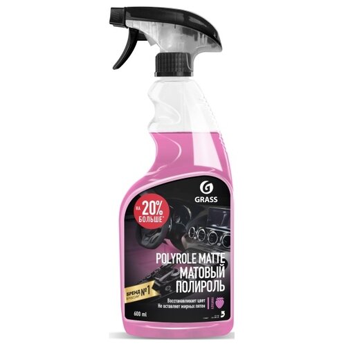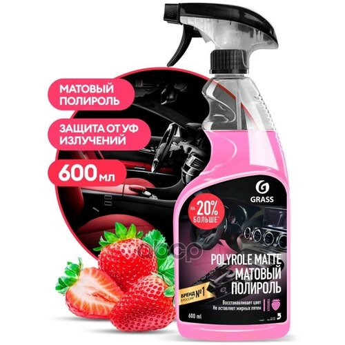 Профессиональная средство для очистки салона автомобиля универсальная полироль Grass Polyrole Matte клубника, 600 мл. для чистки салона автомобиля поможет существенно преобразить автомобильный салон и придать ему максимально привлекательный вид. Профессиональная автохимия может использоваться для приборных панелей, быстрого удаления загрязнений с пластиковых поверхностей, торпеды машины, изделий из дерева, винила и кожи. Автохимия автомобильные товары от компании Грасс представляют вам Экспресс реставратор восстановитель с распылителем который выполняет защитную функцию, эффективен против оседания пыли, маскирует царапины, придает обработанным приборам матовый блеск. Благодаря такой пропитке создается защита от УФ лучей. Восстанавливающий жидкий спрей очиститель антипыль полироль изготовлен по уникальной формуле, которая оказывает сильный эффект при устранении загрязнений. Использовать полироль следует с губкой или салфеткой микрофиброй для обработки покрытий авто. **Способ применения:**нанести на поверхность с помощью распылителя или губки и распределить равномерно по поверхности круговыми движениями. Не допускать попадания на стекла и зеркала.
