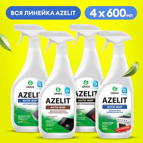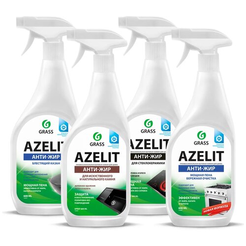 Набор для уборки от Grass - вся линейка средств Азелит в одном наборе Azelit из 4-х штук для уборки кухни средство Азелит для камня, средство Азелит для стеклокерамики, средство Азелит казан, средство Азелит антижир. Чистящее средство Антижир для кухни Azelit спрей 600 мл от Grass - современная бытовая химия, является отличным помощником для уборки дома. Обладает мощной пеной, бережно очищает поверхность и поддерживает ежедневную чистоту без лишних усилий. Удаляет жир, нагар, копоть и пригоревшую пищу с эмалированных, хромированных поверхностей, изделий из стекла, нержавеющей стали, фаянса, фарфора, кухонных плит, мультиварок, фритюрниц, грилей, духовых шкафов и микроволновых печей. Прекрасный стеклоочиститель. Жироудалитель Азелит содержит активные вещества, расщепляющие жир, действие которых гарантирует быстрый результат без особых усилий. Содержащие в составе активные вещества, которые позволяют очистить до блеска даже фритюрный прибор. Моющие средства сделает кухню максимально чистой и блестящей. Заказать набор Grass выгоднее, чем каждое средство отдельно.
