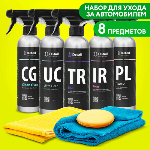 DETAIL Универсальный набор для ухода за автомобилем / для детейлинга авто 8 предметов включает в себя следующие составы:1.DETAIL Очиститель салон автомобиля UC Ultra Clean 500 мл – это универсальный очиститель интерьера авто, готовое к применению чистящее средство для любых типов ткани, пластика, обивки крыши, отделки дверей, ковровых покрытий. Эффективно удаляет стойкие загрязнения, не оставляет следов и разводов. Не размягчает ткань, не приводит к провисанию тканевых обивок. Не содержит трудноудаляемых компонентов.2. DETAIL Полироль для пластика PL Plastic 500 мл – полирующее средство в состав для ухода за пластмассовыми поверхностями внутри салона, которое придаёт поверхности матовый натуральный вид, защищает от выгорания и деформациии, действует как антистатик.3.DETAIL Очиститель стекла СG Clean Glass 500 мл - это готовый к применению очиститель стекол на спиртовой основе. Средство быстро и эффективно очищает стекла автомобилей, зеркала, тонирующие пленки и другие спиртостойкие поверхности. Позволяет мгновенно получить чистую поверхность без разводов. Обладает высокими обезжиривающими свойствами. Безопасен для обработки стекол из поликарбоната.1.DETAIL Очиститель дисков автомобиля / очиститель кузова от металлических вкраплений IR Iron 500 мл – очиститель кузова и колесных дисков от железистых налетов и тяжелых загрязнений. Уникальная pH-сбалансированная формула состава безопасна для различных поверхностей автомобиля. Чистящее средство Iron эффективно справляется с дорожным налетом на ЛКП, стёклах и зеркалах. Состав разработан специально для очистки колесных дисков. Очиститель незаменим для удаления въевшейся тормозной пыли на дисках, которую невозможно полностью очистить обычными средствами. Iron расщепляет загрязнение за несколько минут, по завершении приобретая малиновый (марганцевый) оттенок.2. DETAIL Чернитель для шин резины TR Tire 500 мл - чернитель резины с гидрофобными, защитными и восстанавливающими свойствами. Tire (TR) мгновенно придает шинам эффектный внешний вид, возвращая им первоначальный цвет. Образуемая на поверхности грязеводоотталкивающая пленка защищает их от растрескивания и выгорания.6. Аксессуары необходимые для использования составов: салфетка для очистки стекла, микрофибровая салфетка, аппликатор поролоновый круглый.