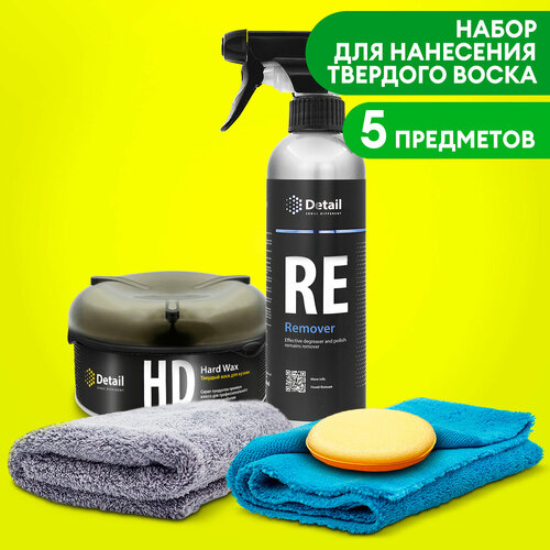 Подарочный набор автохимии для ухода за кузовом автомобиля Detail для авто автокосметика набор, 5 предметов. Автохимия для ухода за кузовом автомобиля. В наборе необходимые товары для автомобиля. Набор для нанесения твердого воска. Включает в себя обезжириватель, твердый воск, полотенца и аппликаторы для нанесения и располировки. 1. Произведите двухфазную мойку с помощью бесконтактного шампуня и ручного шампуня без усилителей блеска и силиконов в составе. 2. Очистите кузов от битума и металлических вкраплений. 3. Осушите кузов. 4. Обезжирьте поверхность с помощью состава Remover и микрофибрового полотенца DF. Выждите не менее 5 минут перед следующим этапом. 5. Круговыми движениями нанесите твёрдый воск Hard Wax с помощью поролонового аппликатора на обрабатываемую поверхность. 6. Через 3-5 минут, после того как поверхность помутнела, легкими движениями располируйте твёрдый воск микрофибровым полотенцем Soft Cloth (SC). Нанесение твёрдого воска необходимо производить подетально. После нанесения твёрдого воска рекомендуется не мыть авто минимум 3 дня. Нанесение твёрдого воска рекомендуется производить в закрытом помещение, при температуре 22 градуса, и влажности не выше 60%. Высокоэффективный базовый обезжириватель. Remover (RE) позволяет максимально очистить поверхность автомобиля перед нанесением любого защитного покрытия для достижения лучших защитных свойств и долговечности. Эффективно обезжиривает ЛКП и обладает антистатическим эффектом. Если вы не знаете, что подарить парню, мужу, коллеге, отцу, подарочный набор, автохимия Detail - это прекрасная возможность порадовать своих близких на день рождения, новый год, день защитника отечества (подарок на 23 февраля), день автомобилиста. Подарочный набор порадует как подарок девушке, так и подарок мужчине! Не нужно быть определенного пола, чтобы ухаживать за своим автомобилем. Всем нравится находиться в ухоженном автомобиле с приятным запахом. Удачи на дорогах!