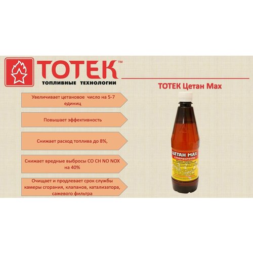 TOTEK Цетан макс 500 Препарат для тюнинга дизельного топлива. Современная топливная присадка для регулирования процессов горения топлива в дизельном двигателе. Способ применения: В бак перед заправкой выливаете содержимое флакона пропорционально заправляемому количеству топлива