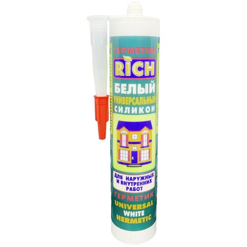 Герметик универсальный силиконовый RICH предназначен для строительных и ремонтных работ: вентиляционные системы, кухни и ванны, морозильные камеры, остекление. Обладает отличной агдезией к большинству строительных материалов: стекло, металл, керамика, дре
