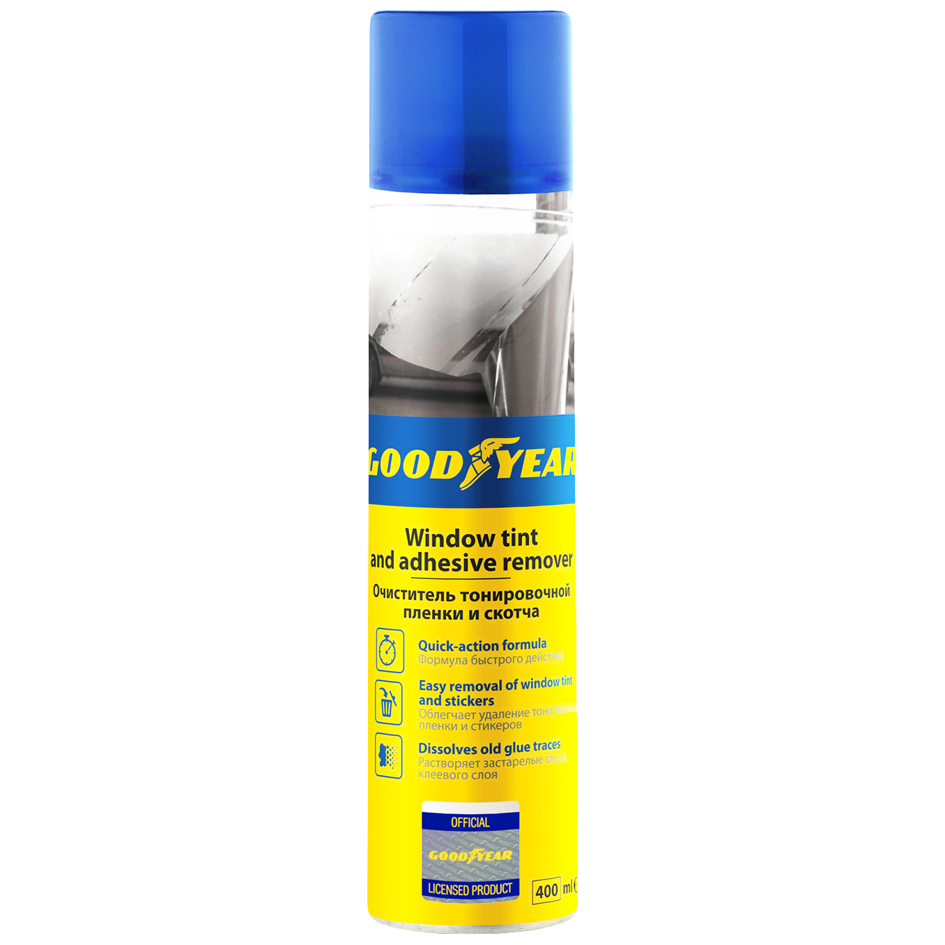 Очиститель тонировочной пленки и скотча от Goodyear предназначен для удаления следов клея, наклеек, скотча и тонировочной пленки с стеклянных, металлических, пластиковых, керамических, окрашенных поверхностей.Средство быстро размягчает даже застарелые следы клея и может использоваться для снятия наклеек с мебели, бытовой техники и домашней утвари.Упаковка-аэрозоль позволяет равномерно наносить очиститель на поверхность. Средство подходит для наружных и внутренних работ.Перед применением ознакомьтесь с инструкцией на тыльной стороне упаковки.Состав: Органический растворитель >30%, Пропан-бутан ˃30%, Алифатические углеводороды 5-15%, Функциональные добавки <5%.Предостережение: Огнеопасно! Баллон под давлением. Не курить во время использования. Обязательно использование СИЗ органов зрения (защитные очки), кожи рук (перчатки) и спецодежды. Предохранять от ударов, попадания прямых солнечных лучей и нагревания свыше 50 ̊С. Не вскрывать и не сжигать даже после использования. Избегать попадания в глаза и внутрь. Не вдыхать испарения. Использовать только по прямому назначению в хорошо проветриваемом помещении. Не распылять вблизи открытого огня и раскаленных предметов. Не разбирать и не давать детям.Особенности:Формула быстрого действияОблегчает удаление тонировочной пленки и стикеровРастворяет застарелые следы клеяСрок годности 36 месяцев