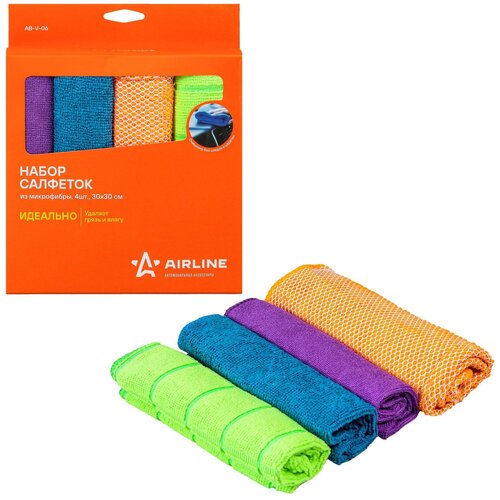 В набор изделий для уборки от AIRLINE входят 4 салфетки различных цветов, упакованные в картонную коробку. Салфетки состоят из микрофибры, которая отличается повышенными влаговпитывающими показателями.