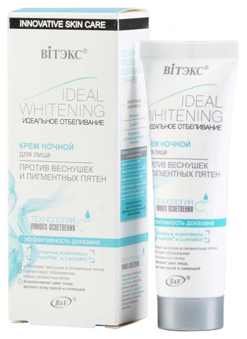 Теперь для осветления темных пигментных пятен и веснушек достаточно просто нанести ночной отбеливающий крем Витэкс Идеальное Отбеливание Против веснушек и пигментных пятен перед сном. Ночной крем обеспечивает активное отбеливание веснушек и пигментных пятен на коже во время сна, когда кожа находится в состоянии покоя и наиболее восприимчива к действию активных веществ.