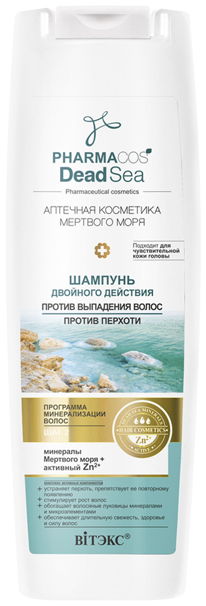 Шампунь двойного действия деликатно очищает волосы и, благодаря синергетическому действию целительной эссенции из 20 минералов Мертвого моря, запатентованного комплекса Dynagen и пиритионата цинка, эффективно помогает направленному решению двух проблем: перхоть и выпадение волос.