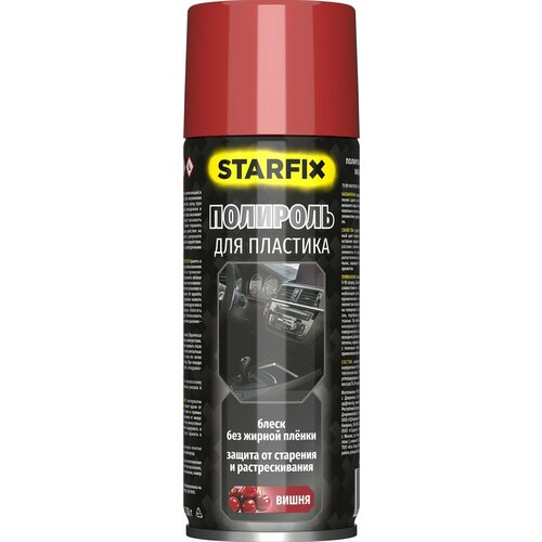 Полироль пластика STARFIX вишня 650 мл (SM-63125-1) применяется для ухода за приборной панелью и декоративной отделки салона автомобиля.Свойства:средство восстанавливает первоначальный цвет изделия;придает поверхности блеск, не оставляет жирной пленки;благодаря содержанию в составе силиконов, защищает обрабатываемые элементы от старения и растрескивания;создает антистатический эффект;препятствует оседанию пыли;защищает от выцветания.Перед применением обрабатываемую поверхность проверить на совместимость с этим материалом на небольшом участке а незаметной области.Тщательно встряхнуть баллон в течение 5-10 секунд. Сделать пробное распыление. Проверить совместимость с обрабатываемой поверхностью на небольшом участке в незаметной области. Распылить состав по поверхности с расстояния 25-30 см. Тщательно растереть средство чистой мягкой тканью.На небольшие, труднодоступные участки, находящиеся в непосредственной близости от поверхности, на которые не рекомендуется наносить полироль (лобовое и боковые стекла, тканевая обивка потолка, сидений и др.) состав необходимо наносить с помощью губки, или тканевой салфетки.