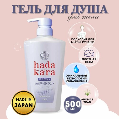 LION Hadakara Жидкое мыло для тела лечебное дезодорирующее увлажняющее, аромат травяного мыла, бутылка-дозатор 500 мл
