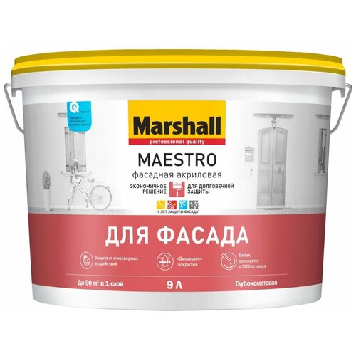Краска для фасадных поверхностей MARSHALL MAESTRO фасадная латексная, матовая, база BW, 9 л 5248873 при нанесении образует гладкое высокоукрывистое, атмосферостойкое покрытие, с хорошими грязе- и водоотталкивающими свойствами. Глубокоматовая структура визуально делает поверхность более ровной, позволяя скрыть небольшие дефекты. Срок службы покрытия на фасадных поверхностях до 10 лет.Область примененияДля наружных работ. Подходит для нанесения на полностью просохшие минеральные поверхности (бетон, штукатурка, кирпич и т. п.). Рекомендуется для окраски фасадов жилых и общественных зданий, подземных гаражей, остекленных балконов, лоджий, тамбуров.Особенности примененияПеред применением разбавить в рекомендованной пропорции водой и тщательно перемешать. Произвести подготовку поверхности. Рекомендуется наносить в два слоя при температуре от +5°C до +30°С, относительной влажности воздуха <80%. Для укрепления базовой поверхности и повышения адгезии слабо связанные или пористые поверхности обработать грунтовкой глубокого проникновения Export Base.