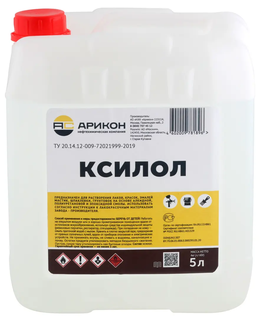 Ксилол Арикон подходит для растворения лака, краски, эмалей, мастики, шпаклевки, грунтовки на основе алкидной смолы (1:1), эпоксидной, виниловой, акриловой смолы (согласно инструкции – производителя ЛКМ). Используется для: кремнийорганических полимеров, нитроцеллюлозы, хлоркаучука, меламино- и мочевиноформальдегидных материалов. Гарантийный срок хранения - 3 года. Огнеопасно. Соответствует требованиям ТУ 38.401-67-108-92. Состав ксилол (CAS 1330-20-7) Применение: разбавление краски согласно рекомендациям производителя ЛКМ (указано на этикетке с маркировкой краски). Страна производства - Россия. Объем - 5 л.