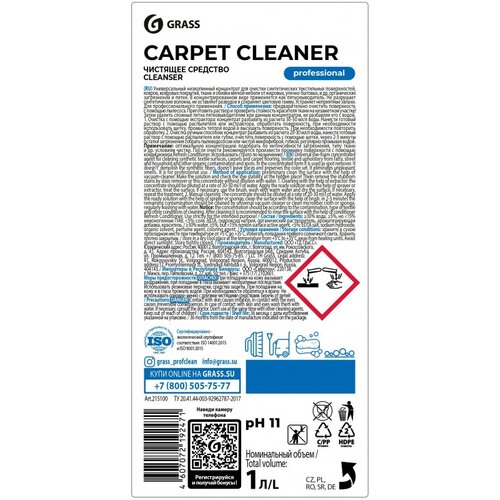 Профхим ковры д/экстрак чистки-пятновывед, щел Grass/Carpet Cleaner,1лОбъем (л): 1. вес брутто: 1 КГ. вес нетто товара: 1 КГ. Срок годности: 24 МЕС. Обрабатываемая поверхность: ковровые покрытия. Консистенция: жидкость. Назначение средства: удаление пятен. Тип уборки: генеральная. Концентрат: Да. Область применения: помещения торговых и деловых центров. Степень пенности: низкопенное. Показатель pH 1% раствора: 11. Показатель плотности: 1.01. Разрешено для детских учреждений: Да. Тип профессиональной химии: щелочное средство. Вес, кг: 1.1. Страна происхождения: Россия. Щелочное низкопенное средство для чистки ковровых покрытий методом экстракции Grass Carpet Cleaner 1 л Назначение. Щелочной низкопенный концентрат против жировых, улично-бытовых и других загрязнений с ковровых покрытий. Не разрушает волокна. Не дает усадку и сохраняет цветовую гамму. Не оставляет разводов. Биоразлагаемый. Пожаро- и взрывобезопасный. Замерзает, после размораживания свойства сохраняются. Способ применения. Применяется для машинной уборки. Очистить поверхность пылесосом, удалить (при необходимости) пятна! Перед применением проверить стойкость красителя ткани на незаметном участке! Используется в виде водного раствора в концентрации 2%-5% (20-50 мл / 1 л воды) заполнить бак, обработать покрытие, смыть тёплой водой, уложить ворс щёткой. До полного высыхания по покрытию не ходить. Пятновыведение: Тщательно пропылесосить ковер или обивку мебели. Нанести средство на пятно в концентрированном виде и оставить на короткое время. Промыть чистой водой. Состав: Вода, 5-15 % неионогенные ПАВ, <5% соль эдта, гидроксид натрия, органический растворитель, ароматизирующий компонент, красительСрок годности: 2 года с момента производства (при соблюдении условий хранения рекомендованных производителем)