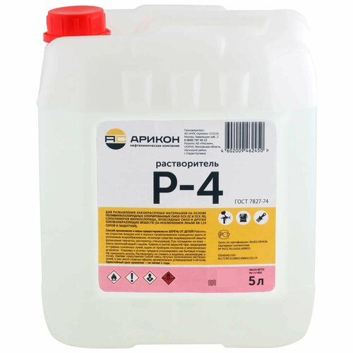 Растворитель Р-4 - состав для ЛКМ на основе поливинилхлоридных и хлорированных смол ПСХ ЛС и ПСХ ЛН, сополимеров винилхлорида, эпоксидных смол. Используется для разбавления ЛКМ (за исключением эмали ХВ 124 – серой и защитной).Гарантийный срок хранения не менее 1 года. Огнеопасно. Соответствует требованиям ГОСТ 7827-74. Состав смесь летучих органических растворителей, в том числе сложных эфиров, ароматических углеводородов и кетонов. Рекомендуется для очистки ЛКМ инструментов кистей, валиков, емкостей.промывания лакокрасочного технического оборудования краскопульта, сопла, емкости для краски и пр.Страна производства - Россия. Объем - 5 л.