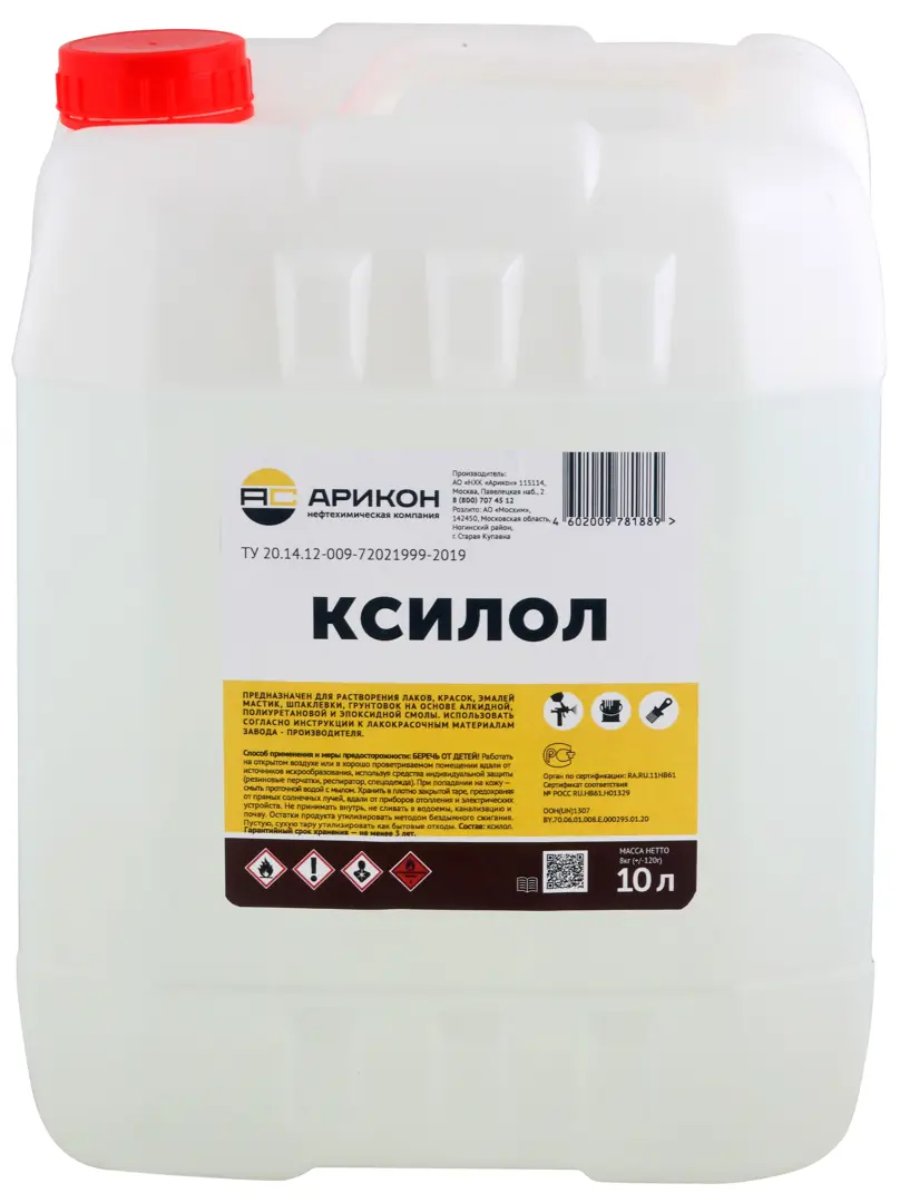 Ксилол Арикон подходит для растворения лака, краски, эмалей, мастики, шпаклевки, грунтовки на основе алкидной смолы (1:1), эпоксидной, виниловой, акриловой смолы (согласно инструкции – производителя ЛКМ). Используется для: кремнийорганических полимеров, нитроцеллюлозы, хлоркаучука, меламино- и мочевиноформальдегидных материалов. Гарантийный срок хранения - 3 года. Огнеопасно. Соответствует требованиям ТУ 38.401-67-108-92. Состав ксилол (CAS 1330-20-7) Применение: разбавление краски согласно рекомендациям производителя ЛКМ (указано на этикетке с маркировкой краски). Страна производства - Россия. Объем - 10 л.