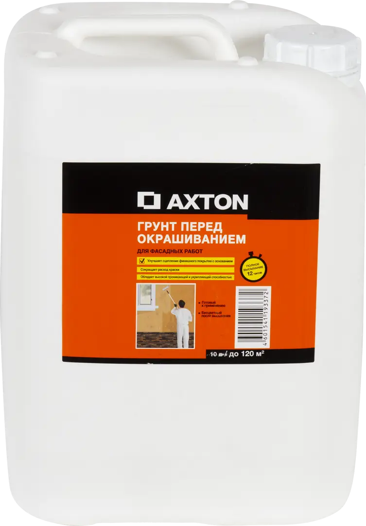 Грунт фасадный акриловый «Axton» используется для обработки внешних стен здания. Позволяет выровнять и укрепить основание, улучшить сцепление с последующим декоративным слоем и сократить расход покрывных материалов. Подходит для любой поверхности (бетона, гипсокартона, кирпича, штукатурки, шпаклевки). Состав не имеет запаха, после высыхания становится бесцветным. Расфасован в емкости объемом 10 л. Страна производства — Россия. Особенности использования Грунт наносится при помощи валика, кисти или краскораспылителя на предварительно очищенную от осыпающихся частиц, пыли и масляных пятен, выровненную, сухую поверхность. Не рекомендуется работать под прямыми солнечными лучами, во время осадков и сильного ветра, при температуре окружающей среды менее +5 °C (оптимальный вариант 15-20 °C). Покрытие полностью высыхает за 12 часов. Остатки грунта можно хранить в плотно закрытой бутыли в течение 18 месяцев со дня изготовления.
